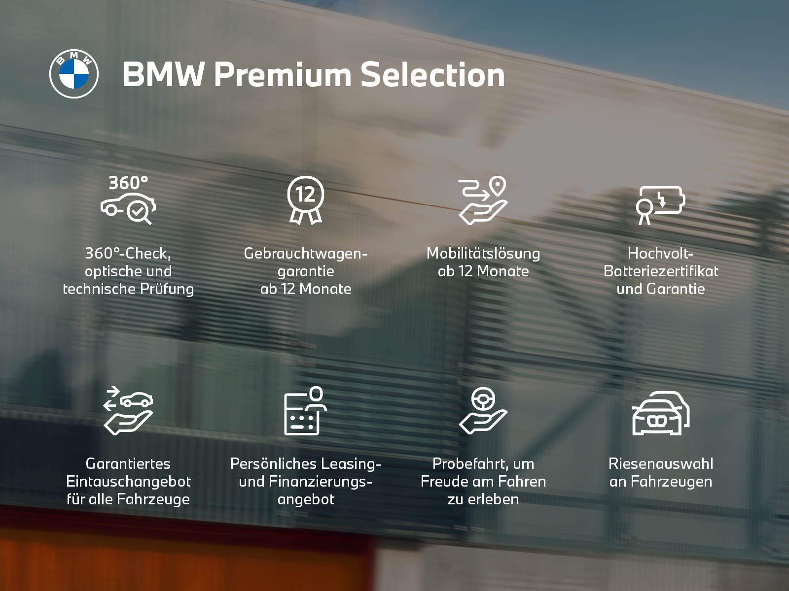 Unsere Gebrauchtwagen (BMW Premium Selection und MINI Next) sind mit einer 12-monatigen Gebrauchtwagengarantie ausgestattet. Diese Garantie bietet zusätzlich zur gesetzlichen Gewährleistungspflicht eine Baugruppengarantie, die ein ganzes Jahr sorgenfreies Fahren ermöglicht.